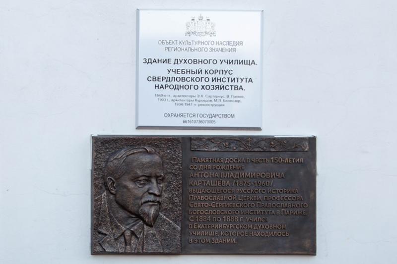 Памятную доску установили на фасаде корпуса УрГЭУ-СИНХ, в котором до революции 1917 года размещалось Екатеринбургское духовное училище. Известно, что с 1884 по 1888 годы Карташев учился в этом здании. Накануне, 14 февраля, скандальную мемориальную доску сняли со стены университета.