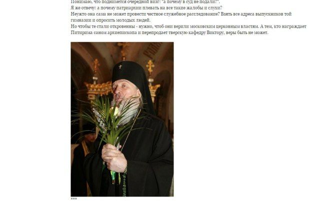 «Надевать трусы или полотенца в бане строго запрещено. Митрополит ходит голым в толпе голых мальчиков, пьет чай, купается с ними в бассейне. А самые близкие дети допускаются до такого обычая – натирание медом владыки. То есть мальчик наливает на спину митрополиту мед и нежно массажирует его. К этому пускаются только некоторые гимназисты. Владыка так любит баню, что ни разу не пропустил ее. Хотя дел у него много», - пишет аноним.
