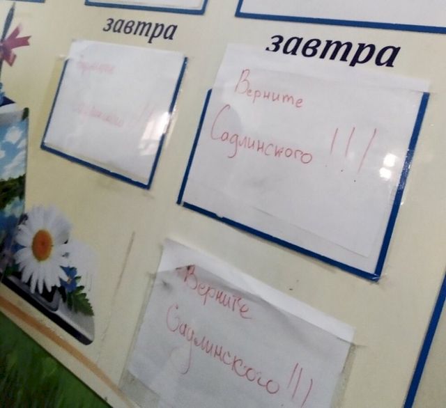В сообществе опубликовано фото доски с расписанием, на которой прикреплен листок с надписью «Верните Садлинского!». По данным местных СМИ, дети вышли во двор школы № 2 с табличками и крикнули: «Виктор Садлинский, мы с вами».