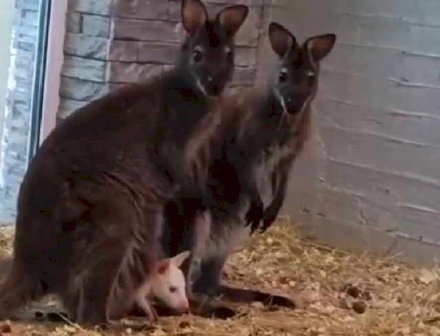 Малыш пока предпочитает проводить время в сумке мамы, но уже показывает мордочку и начинает познавать мир. Ранее в этом же питомнике на свет появился кенгуру обычной расцветки. К середине марта он вылез из маминой сумки.