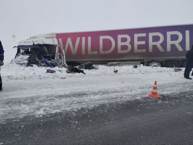 В Тюменской области сегодня столкнулись фура MAN компании Wildberries и КамАЗ с полуприцепом, который перевозил зерно. В результате ДТП водитель одного из большегрузов погиб, ехавшего с ним сменщика госпитализировали с травмами.