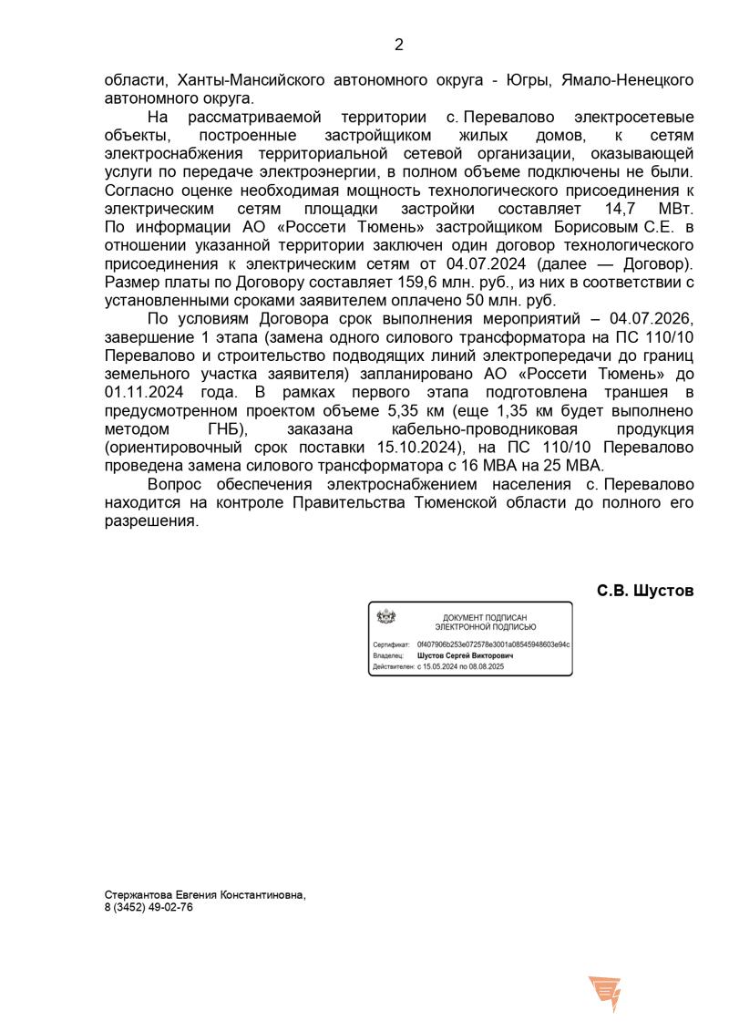 По условиям Договора срок выполнения мероприятий – 04.07.2026, завершение 1 этапа (замена одного силового трансформатора на ПС 110/10 Перевалово и строительство подводящих линий электропередачи до границ земельного участка заявителя) запланировано АО «Россети Тюмень» до 01.11.2024 года. В рамках первого этапа подготовлена траншея в предусмотренном проектом объеме 5,35 км (еще 1,35 км будет выполнено методом ГНБ), заказана кабельно-проводниковая продукция (ориентировочный срок поставки - 15.10.2024), на ПС 110/10 Перевалово проведена замена силового трансформатора с 16 МВА на 25 МВА.