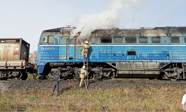 Прибывшее на место происшествия пожарно-спасательное подразделение обнаружило открытое горение в двигательном отсеке тепловоза. К тушению пожара привлечено 17 человек и 6 единиц техники, погибших и травмированных нет, угроза распространения огня отсутствует.