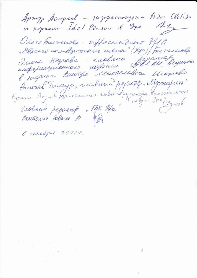 Под обращением к Марату Васимову подписались 11 редакций: «Коммерсантъ – Уфа», «РБК – Уфа», «Медиакорсеть», «Пруфы.рф», UFA1.RU, «Идель Реалии» (СМИ внесено в реестр иноагентов), «Комсомольская Правда – Уфа», телеканала UTV, радиостанций «Бизнес ФМ» и «Эхо Москвы в Уфе», ЕАН.Уфа, а также председатель башкирского отделения «Профсоюза журналистов России».