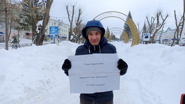 «Радий Фаритович, заберите клан Мавлиевых из Нефтекамска», — написано на плакате, с которым парень вышел к центральной городской аллее.